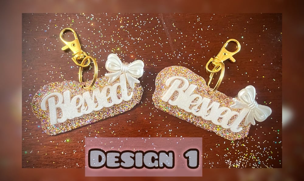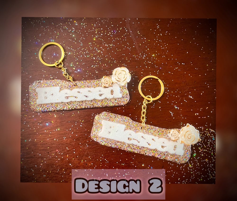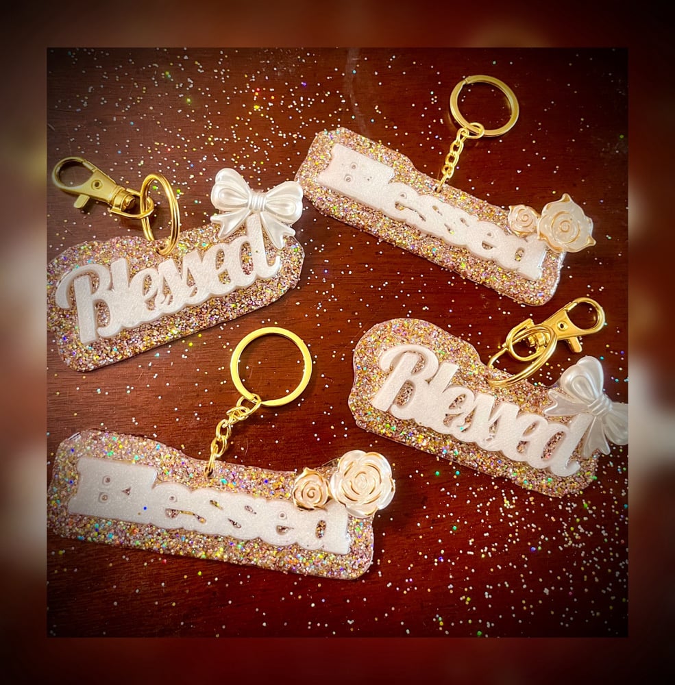 Handmade Blessed Resin Keychains ✨These sparkling resin keychains feature the uplifting word “Blessed” in bold white lettering, set against a dazzling glitter background. Each piece is uniquely decorated with elegant embellishments like pearl bows or rose charms, giving them a chic and stylish touch. Finished with a sturdy gold keyring and clasp, they make the perfect accessory for your keys, bag, or as a thoughtful gift to remind someone of their blessings.
