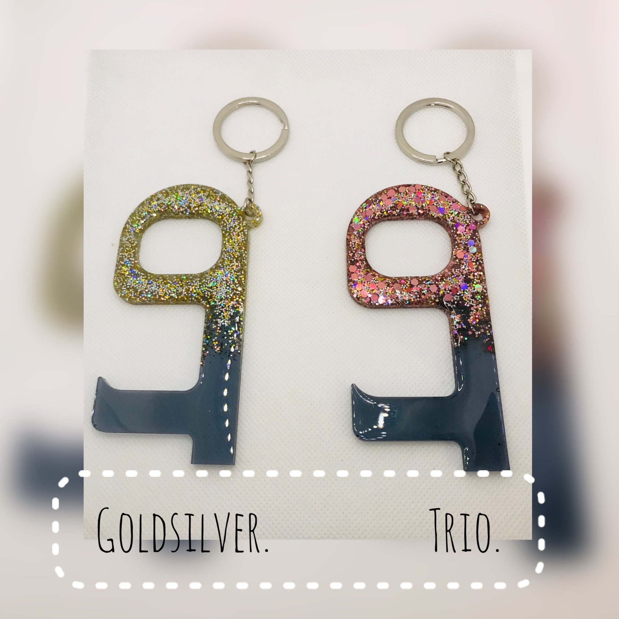 Resin NO touch door opener and button pusher can be used to open doors and push buttons hands free. Keychains are designed with black mica color and chunky glitters (Rose Gold, Gold, Silver). You have a choice of 4 different colors.