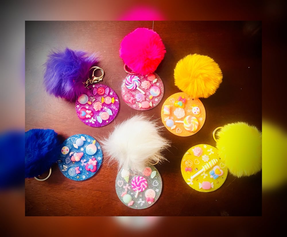 Each round resin charm is filled with glitter and decorated with candy-inspired embellishments like lollipops, swirls, and sweets. Topped off with a big fluffy pom-pom, these keychains or backpack charms are as playful as they are stylish.